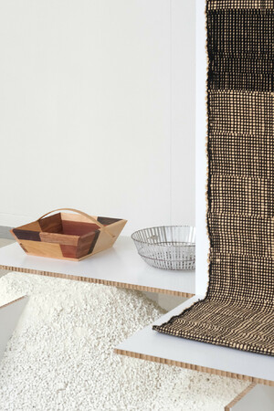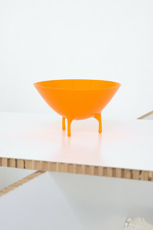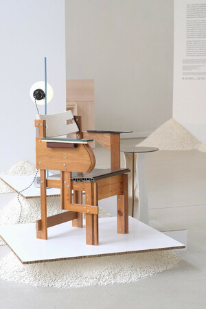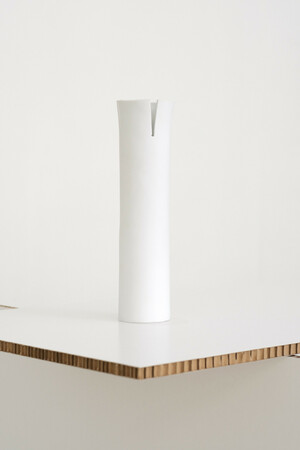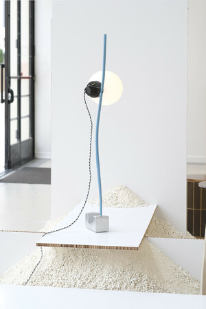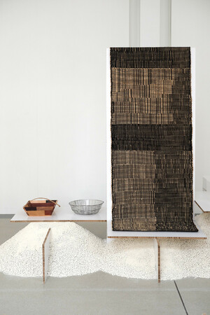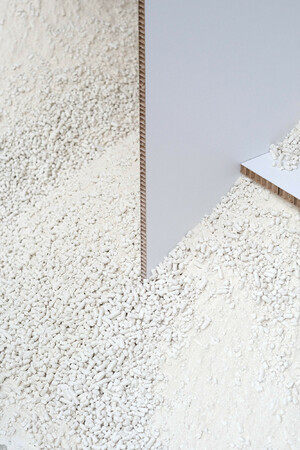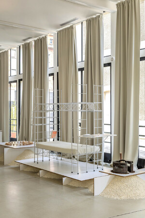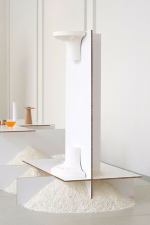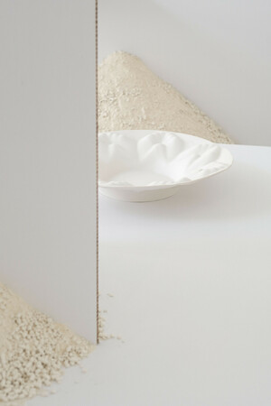 En support aux œuvres se dressent des amas de kaolin, une argile blanche et friable utilisée pour la fabrication de la porcelaine. Dormante depuis plus de vingt ans dans l’atelier du Moulin de la Manufacture de Sèvres, voisin de l’espace d’exposition, cette matière première trouve ici par son déplacement un nouvel usage temporaire. Elle ponctue l’espace de différents tumuli dont la mise en forme répond à la nature du matériau, à sa manutention et se dessine par la force de gravité. Tout en envisageant la disponibilité de cette ressource comme une opportunité de rappeler le lien historique entre la manufacture et son école - actuellement occupée par le JAD - la proposition scénographique affirme un souci de frugalité, en articulant les disponibilités du contexte de l'exposition.