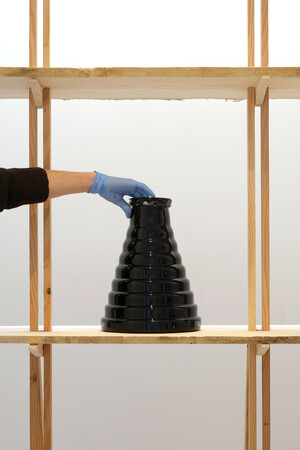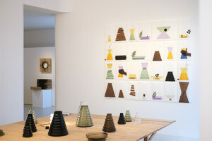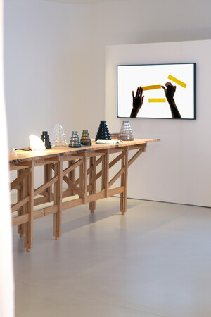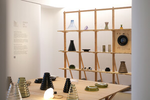 A cette occasion sont présentées en marge d'objets édités, des pièces de recherche ayant jalonné les expérimentations en atelier, autour du moule modulaire conçu pour le projet. Elles font face à une série d'itérations graphiques, des collages préparatoires utilisés lors des séances de soufflage avec les verriers, comme un ensemble de sujets à mettre à l'épreuve de la matière, des souffleurs, du moule et de la température des fours.